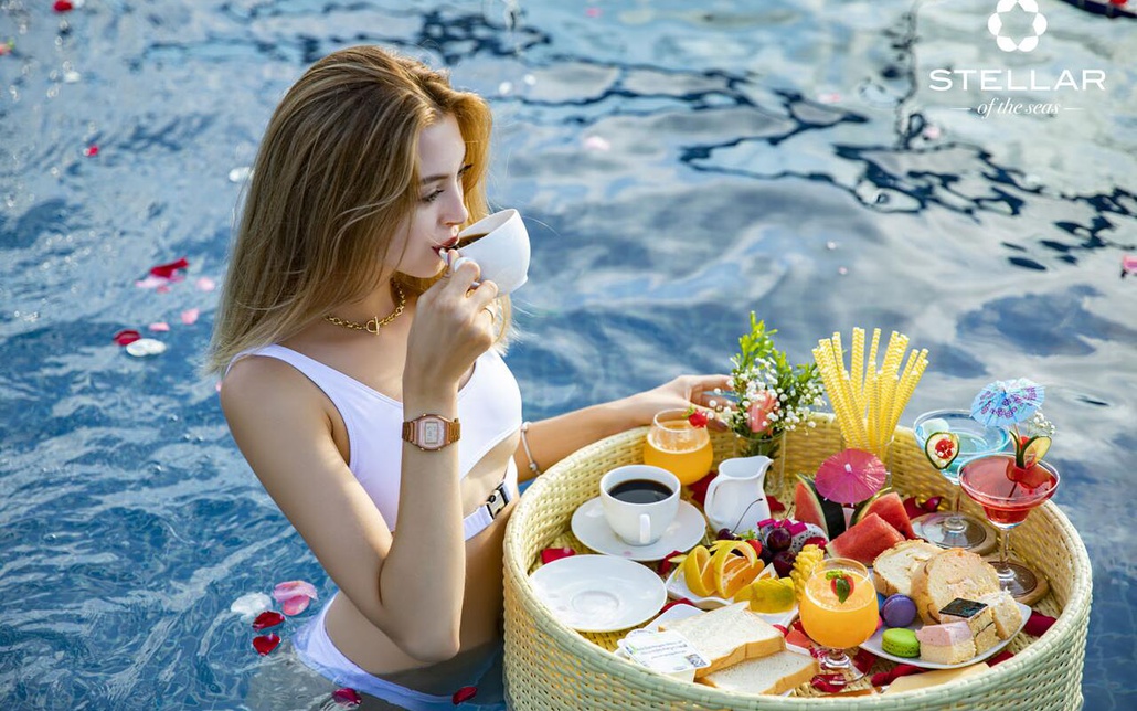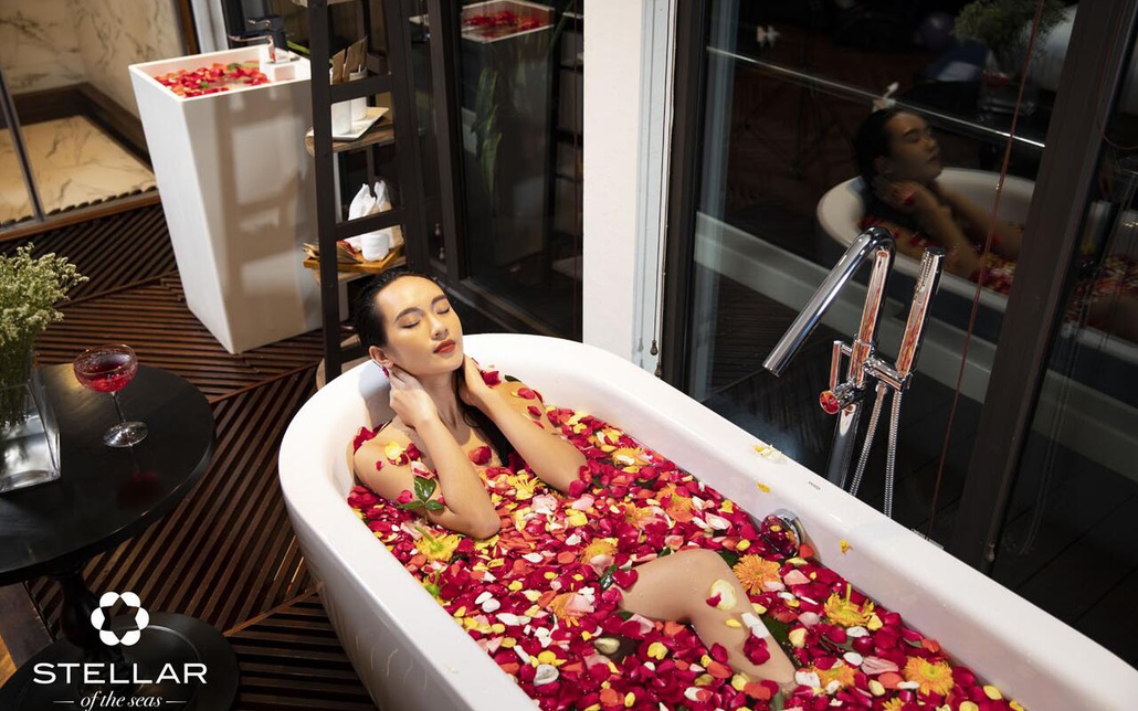 Bên trong 1 phòng nghỉ sang trọng trên du thuyền Stellar of the Seas Ngoài ra, du khách còn được trải nghiệm những tiện nghi cao cấp nhất như bể bơi ngoài trời rộng 50m2, sân golf mini, hầm rượu và spa.