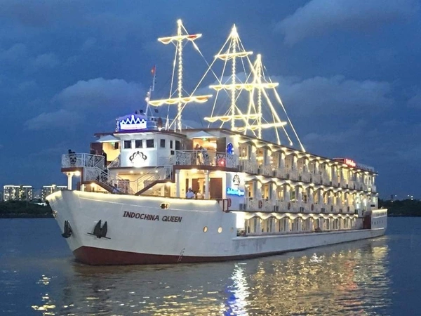 - 19h15: Khai Tiệc Buffet, Du Khách thưởng thức tiệc Buffet với trên 20 món ăn được thực hiện bởi đội ngũ đầu Bếp Indochina Queen chuyên nghiệp, kinh nghiệm lâu năm. Du Thuyền sẽ xuất bến chạy du ngoạn trên Sông Sài Gòn Về Đêm. Du khách sẽ thưởng ngoạn ngắm nhìn cảnh quan, đời sống cư dân hai bên bờ Sông Sài Gòn, cảm nhận sự khác biệt “ Trên Bến Dưới Thuyền” tại một Thành Phố hiện đại, trung tâm kinh tế của cả nước. Du Thuyền sẽ đi ngang qua các địa danh lịch sử như: Cảng Nhà Rồng ( nơi trước đây Bác Hồ ra đi tìm đường cứu nước), Bến Bạch Đằng ( Bến Ngự), cảng Khánh Hội, chạy hướng về cầu Phú Mỹ.